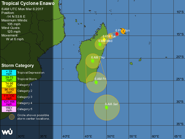 En el Índico sur se encuentra el ciclón tropical "Enawo", el cual ya es un poderoso fenómeno meteorológico natural de categoría 2, con trayectoria del mismo océano a las costas de Madagascar.